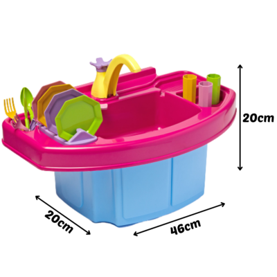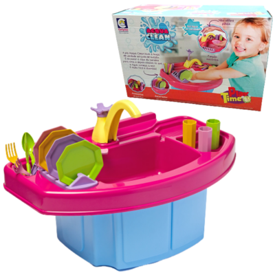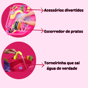 Vem com acessórios divertidos: cuba com tampa, escorredor de pratos, copos, talheres e pratos.