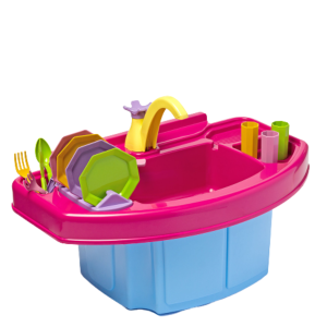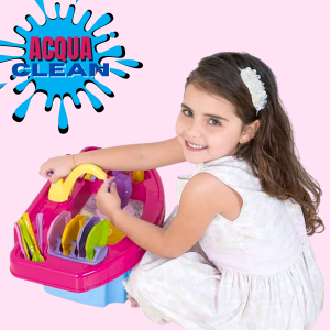 A pia Acqua Clean lava a louça de verdade! Muito fácil e divertido! Funciona à sucção. É só puxar a alça da torneira para cima e depois abaixar, repetindo a operação até começar a sugar a água do reservatório. E quando a água sair é só lavar toda a louça.