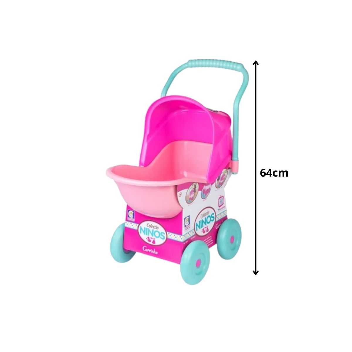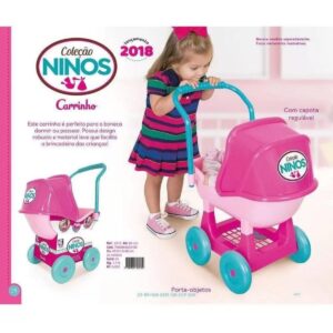 O carrinho de bonecas ninos é perfeito para a boneca dormir ou passear, possui design robusto e material leve que facilita a brincadeira da criança. Além disso, também possui capota regulável e uma haste para para a criança empurrar o carrinho. A altura do carrinho montado é de aproximadamente 64cm.