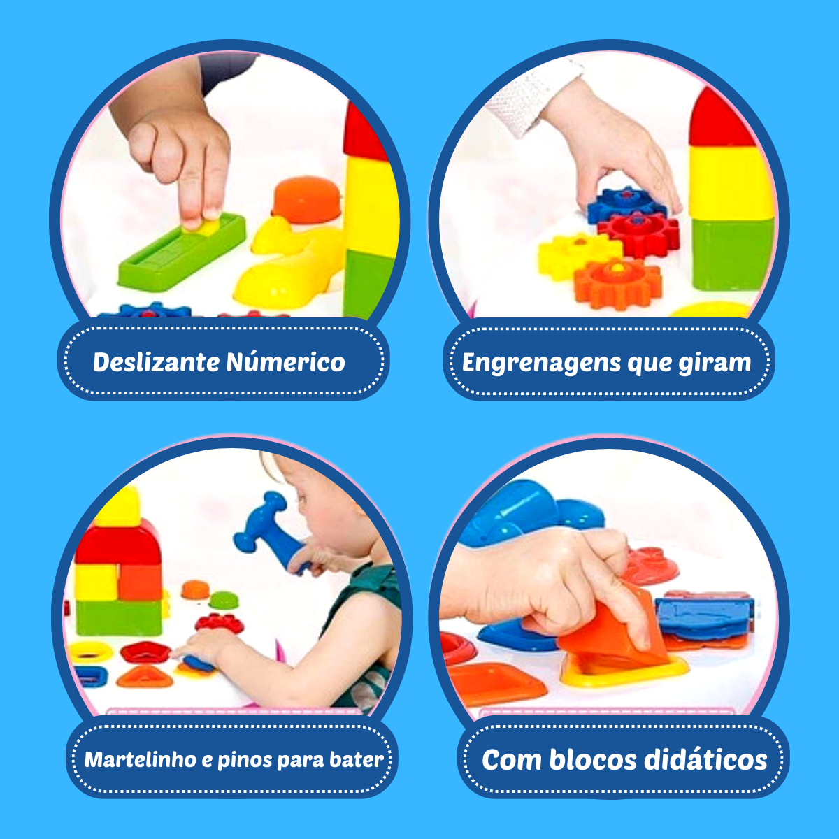 – Conteúdo da Embalagem: Mesa didática, blocos didáticos, engrenagens que giram, martelinhos e pinos para bater.
