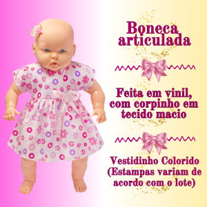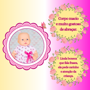 A Boneca Sonho Azul fala 120 frases quando aperta a barriguinha dela. Pede carinho e atenção da crianca, proporcionando horas de diversao e entretenimento. Ela é uma bonequinha meiga, fofa e macia, possui 56cm de altura. Sua cabeça, corpo, bracinhos e perninhas são feitos em vinil perfumado e macio. Sem dúvidas, uma linda boneca para se amar e ser a melhor amiga das crianças.