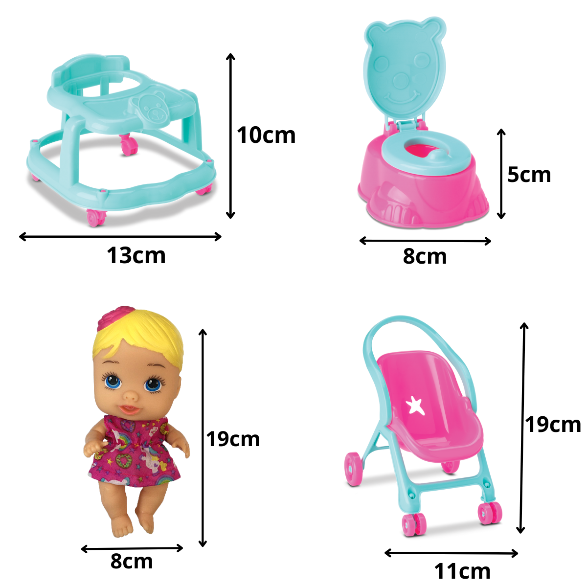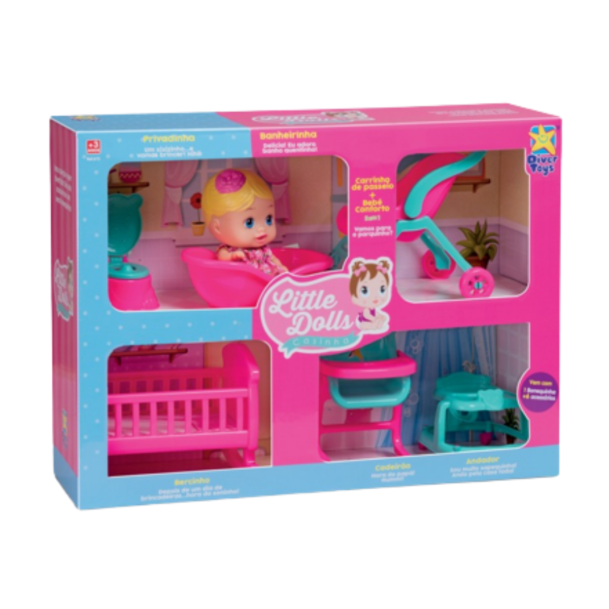 A linda boneca Little Dolls Casinha é super divertida! Ela acompanha diversos acessórios como banheira, cadeira de papinha, troninho, bercinho, andador e um carrinho 2 e 1 que vira bebê conforto, a diversão está garantida! É super fofa e delicada, gostosa de abraçar e apertar, e compõe um delicioso cheirinho de bebê perfumada.