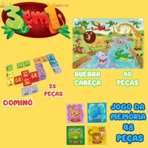 3 jogos em 1 para testar suas habilidades, quebra cabeça de 100 peças, dominó de 28 peças, jogo da memória 48 peças, com esse kit você pode brincar tanto sozinho quanto com a família e amigos, agora sua brincadeira vai ficar ainda mais divertida, indicado para crianças de a partir de 4 anos.