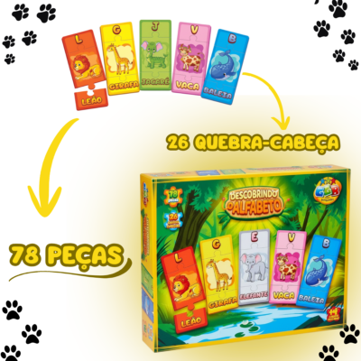 Ao pegar uma letra, será preciso identificar a outra peça que completa o quebra-cabeça, uma com a imagem da letra e outra com a imagem e nome do objeto ou animal que começa com aquela letra.