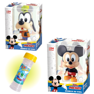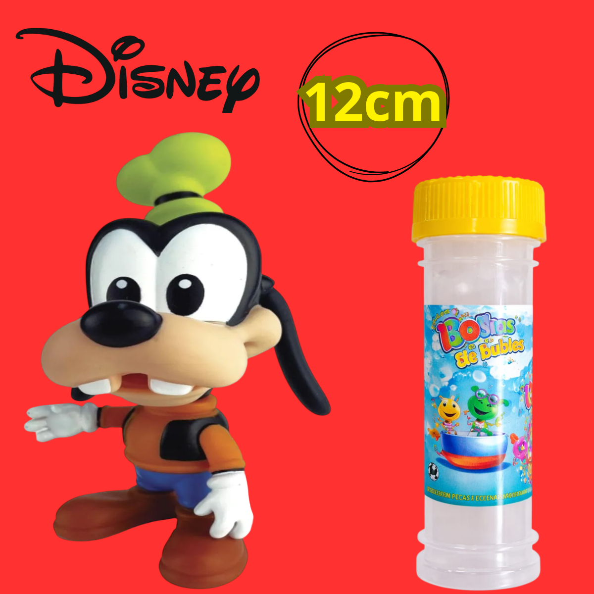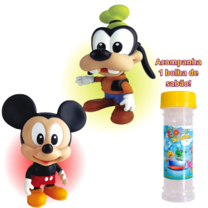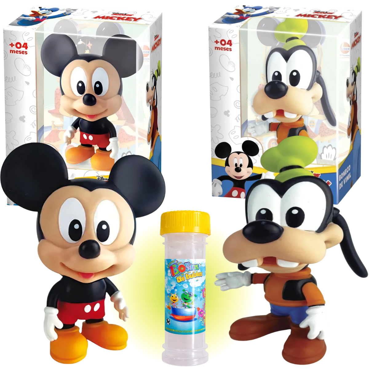 Kit com 1 boneco do Mickey, 1 boneco do Pateta e 1 bolha de sabão, perfeito para a diversão das crianças!