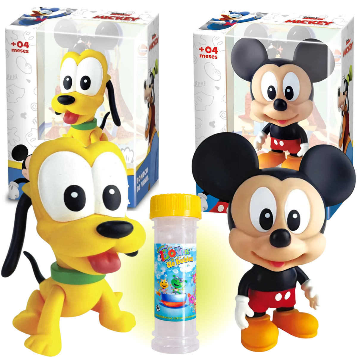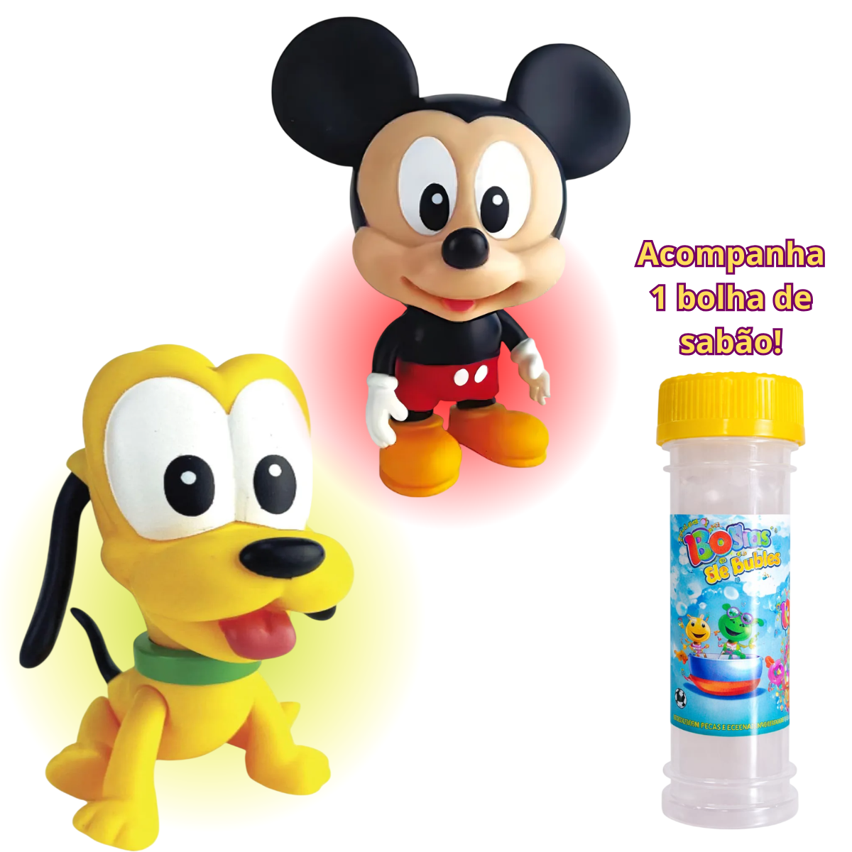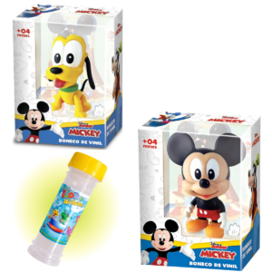 Kit com 1 boneco do Mickey, 1 boneco do Pluto e 1 bolha de sabão, ideal para garantir a diversão das crianças!