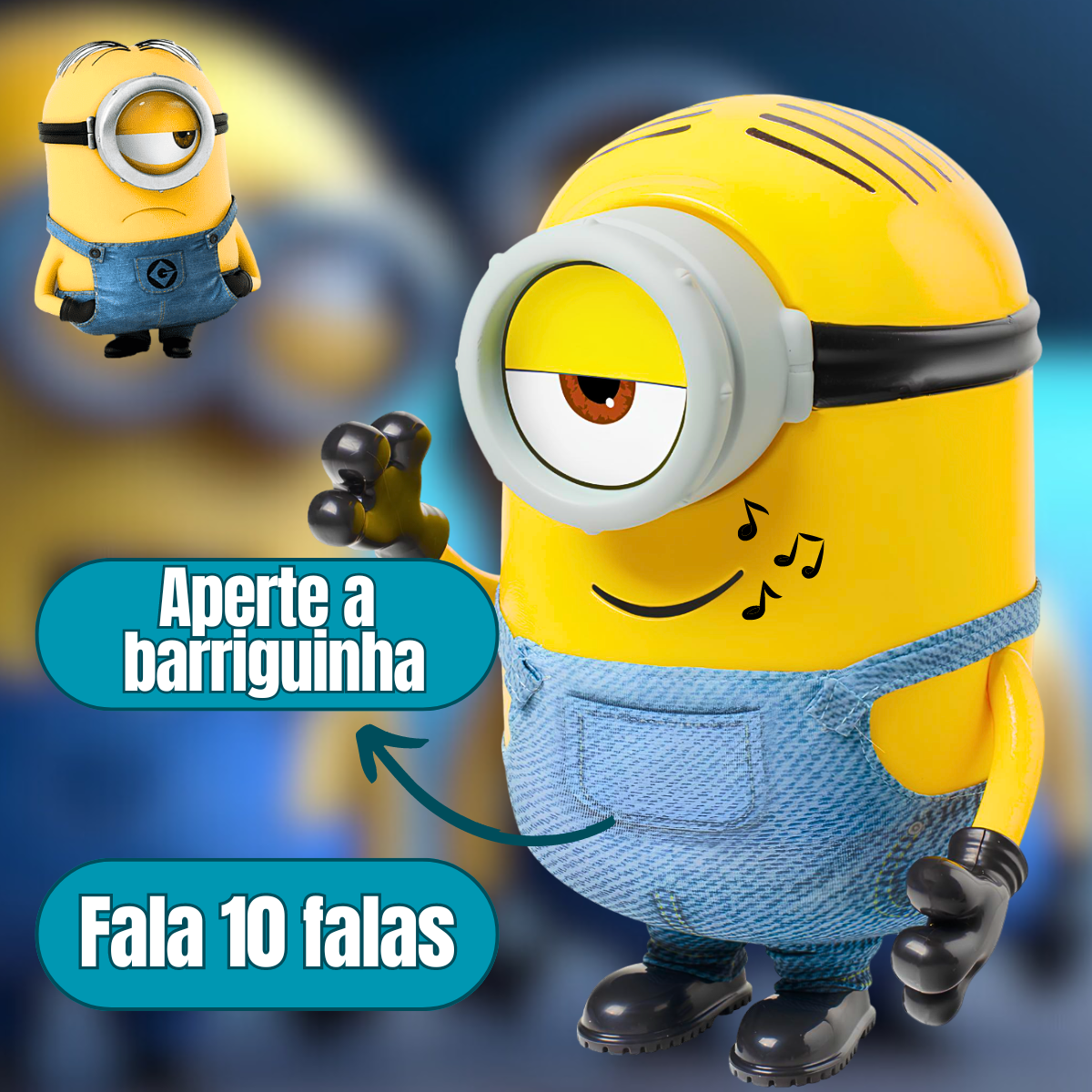 Aperte a barriguinha do boneco do Stuart que ele fala frases e palavras em ”minionese”, a língua dos Minions