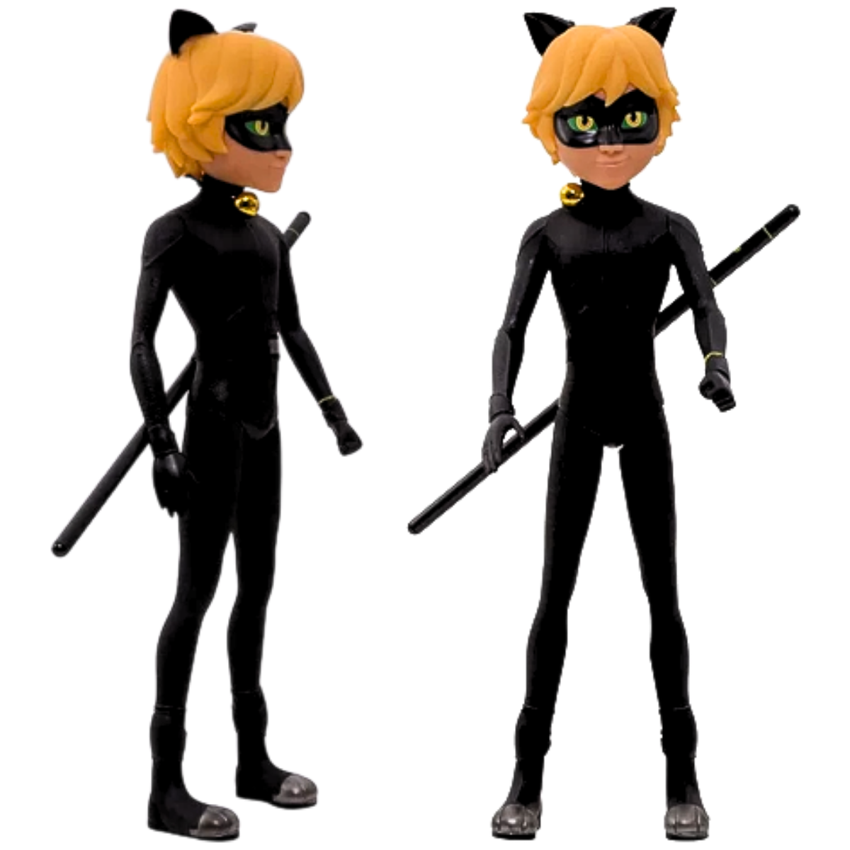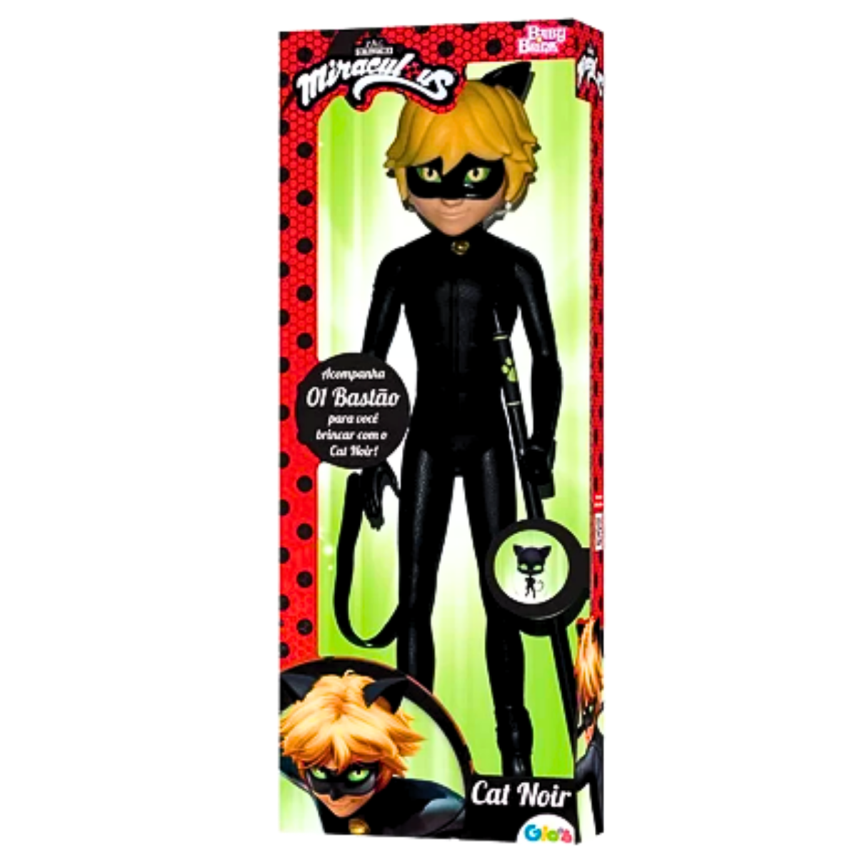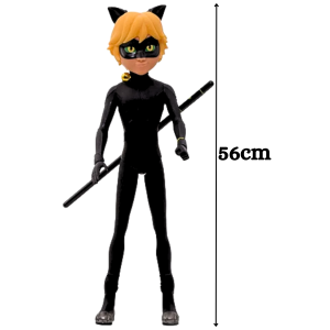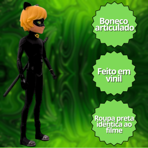Cat Noir é o parceiro da LadyBug para combater os vilões de Paris. Cat Noir agora pode ser seu parceiro de aventuras, ele virou BONECO. Acompanha o bastão do personagem vem com um guizo que emite som ao ser chacoalhado. Boneco Articulado e com a roupa super realista.
