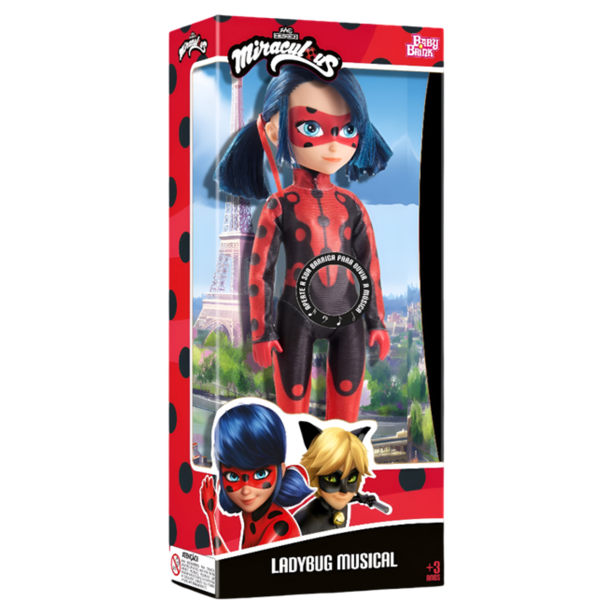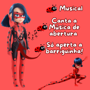 Agora a brincadeira vai ficar bem mais divertida com a Boneca Ladybug Musical. Pressionando sua barriga ela canta a musica do tema de abertura da série de TV! Perfeito para as crianças encenarem as cenas preferidas do desenho, ótimo para estimular a imaginação.