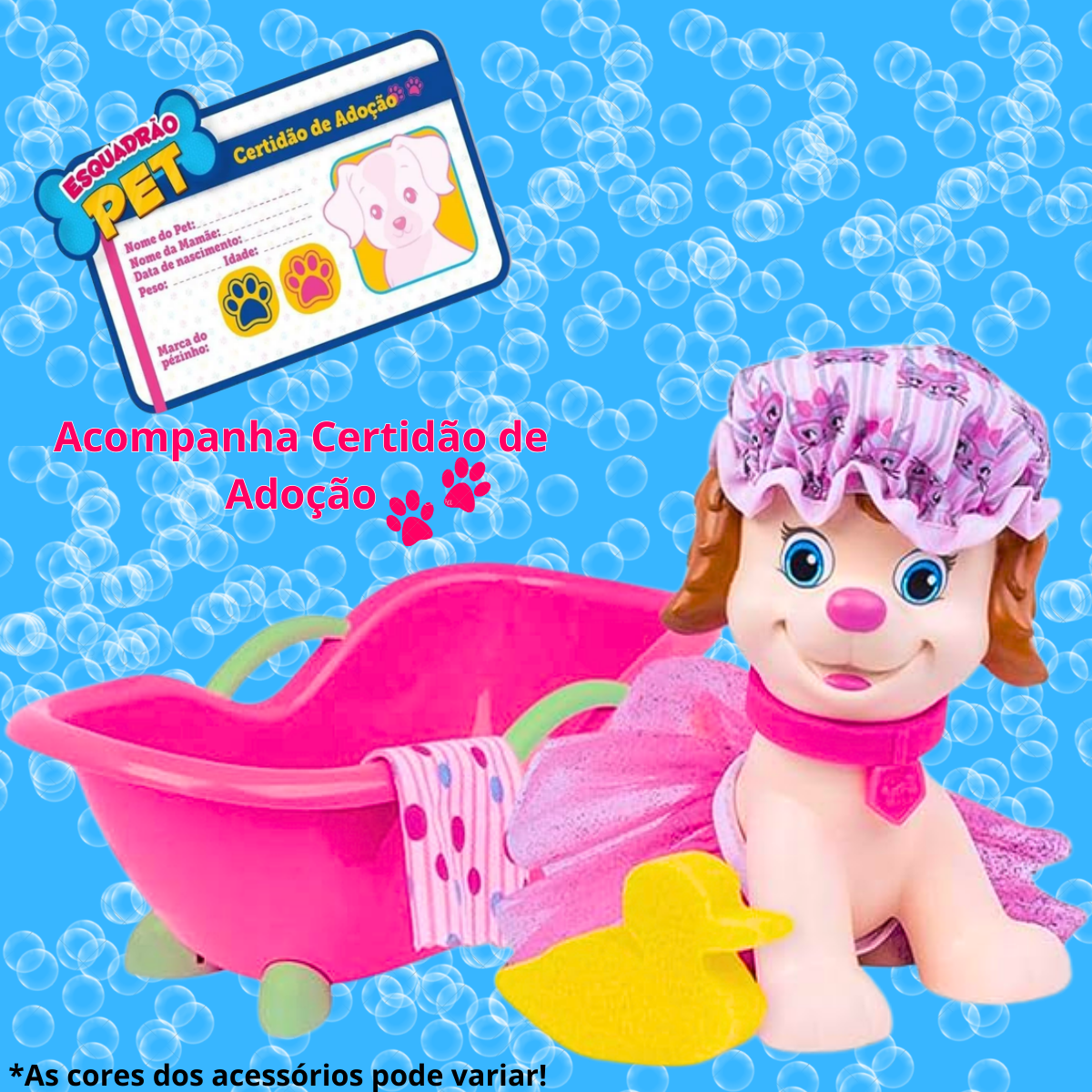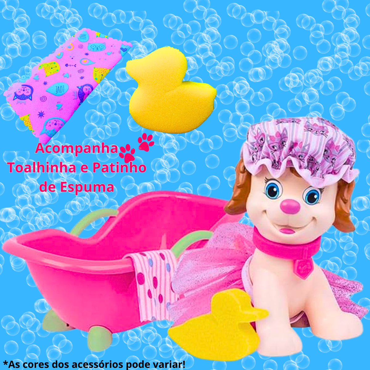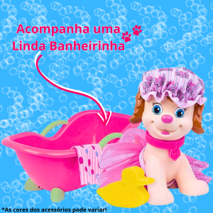 Ela é uma cachorrinha muito linda que é acompanhada de certidão de adoção e muitos acessórios como toalha de banho, patinho de espuma e touca de banho. As crianças vão se divertir na hora do banho cuidando da sua pet. As crianças vão se divertir na hora do banho cuidando da sua pet.