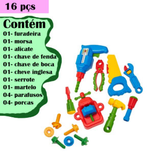 Brinque de consertar as coisas e faça como o papai com este super kit de ferramentas com 16 peças.